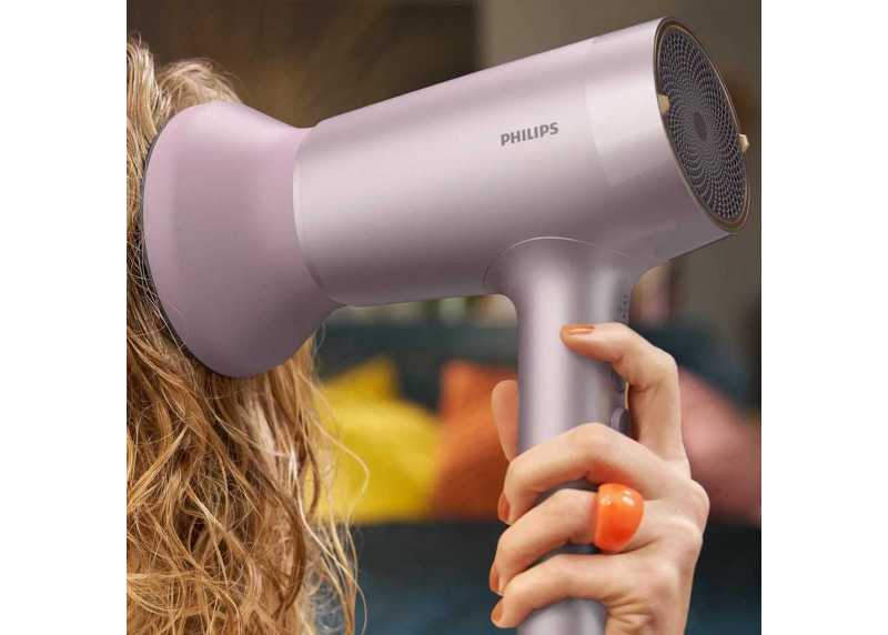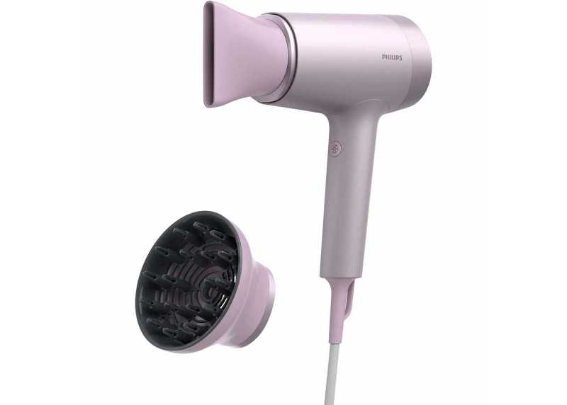 Fén na vlasy s Philips 7000 BHD723/10 s příkonem 1800 W, napětím 220-240 V, 2 rychlostmi, 4 možnostmi nastavení teploty, koncentrátorem, difuzérem a ionizátorem.