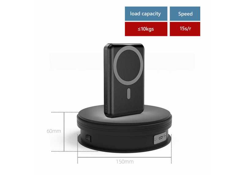 Otočný podstavec otáčí horní deskou kolem dokola v 360 °. Je vhodný pro produktové fotografování či natáčení 360° videa. Celý pohyb kolem dokola tvrá 15 vteřin. S podstavcem je možné otáčet i manuálně. Unese maximálně 10kg předmět. Podstavec je napájen kabelově s konektorem USB-C, otáčí se jen horní deska, která není podsvícená.