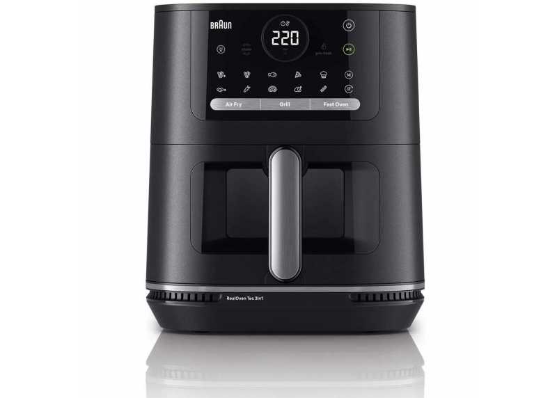 Braun MultiFry 5 HF5073IBK je horkovzdušná fritéza 3 v 1 pro smažení horkým vzduchem, grilování a rychlé pečení. Dvojice topných těles nad a pod potravinou zajišťuje rovnoměrnou distribuci tepla díky technologii RealOven, takže jídlo je křupavé na povrchu a šťavnaté uvnitř. Velký objem 6 litrů pojme až 1,6 kg hranolků nebo zhruba 1,5 kg kuřete a pohodlně obslouží celou rodinu. Přehledný dotykový panel nabízí 20 automatických programů, teplotu lze jemně nastavit v rozmezí 80–220 °C a časovač pohlídá konec přípravy. Fritovací koš a mřížka jsou vyjímatelné a vhodné do myčky.