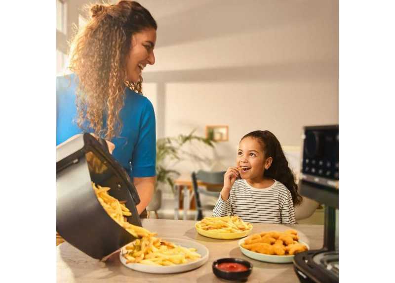 Praktické průhledové okénko a vnitřní osvětlení umožní sledovat průběh přípravy bez otevírání zásuvky. Rychlý náběh teploty šetří čas a díky účinné cirkulaci vzduchu připravíte oblíbené pokrmy s minimem oleje. Tělo v matně černém provedení se snadno udržuje a zapadne do moderní kuchyně. Příkon 2000 W dává dostatek výkonu pro rychlé výsledky, po skončení se spotřebič automaticky vypne.