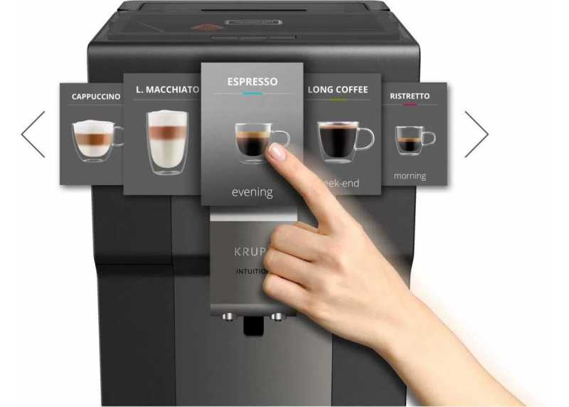Krups Intuition Preference+ je elegantním, distinguovaným a stylovým kávovarem pro tvorbu těch nejkrásnějších okamžiků dne - chvílí s kávou. Z široké škály receptů vám připraví, na co dostanete chuť - ráno cappuccino, po obědě espresso, k dezertu latte. Integrovaný mlýnek mele kávu v pěti stupních hrubosti. Kávovar je schopný si zapamatovat až 8 individuálně nastavených oblíbených nápojů. Při přípravě kávy doprovází kávovar barevné podsvícení, které intuitivně prozrazuje, co se zrovna s kávovarem děje. Barvy a jejich význam si můžete přizpůsobit, ale červené podsvícení rovnou značí potřebu údržby. Volba nápojů i všechna nastavení probíhají na barevném displeji.