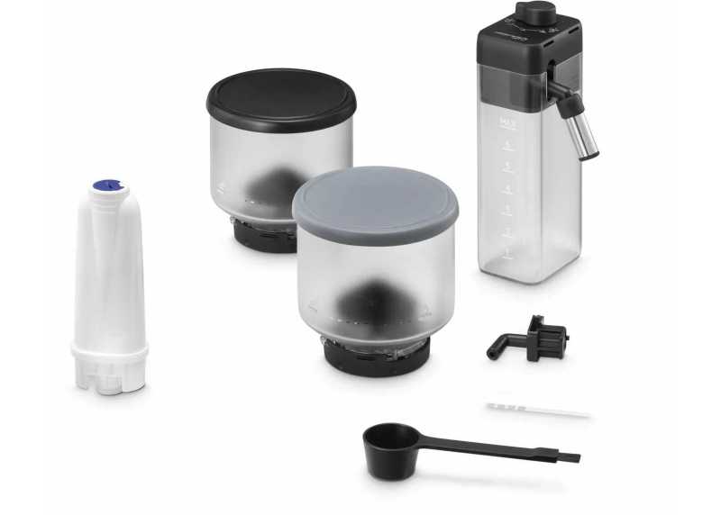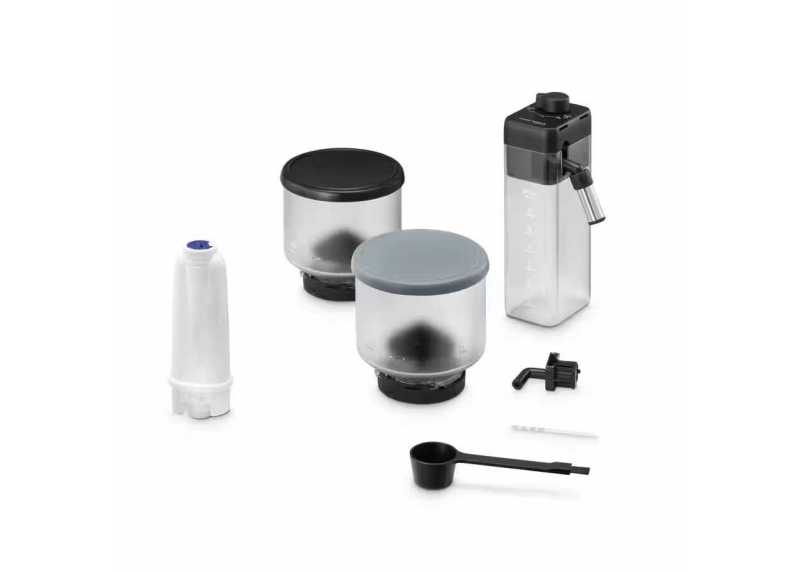 Kávovar má vlastní mlýnek na kávová zrna a jedno nápadité překvapení - vyměnitelné zásobníky na kávová zrna. Pokud tedy zatoužíte ochutnat nový druh kávy, nemusíte čekat až dopotřebujete stávající, ale jednoduše vyměníte stávající zásobník za druhý s novými zrnky. V samotném mlýnku přitom vždy pár zrnek zůstane, ale je to taková dávka, která vystačí přesně na jednu kávu, nebo zrnka můžete vymlít naprázdno.