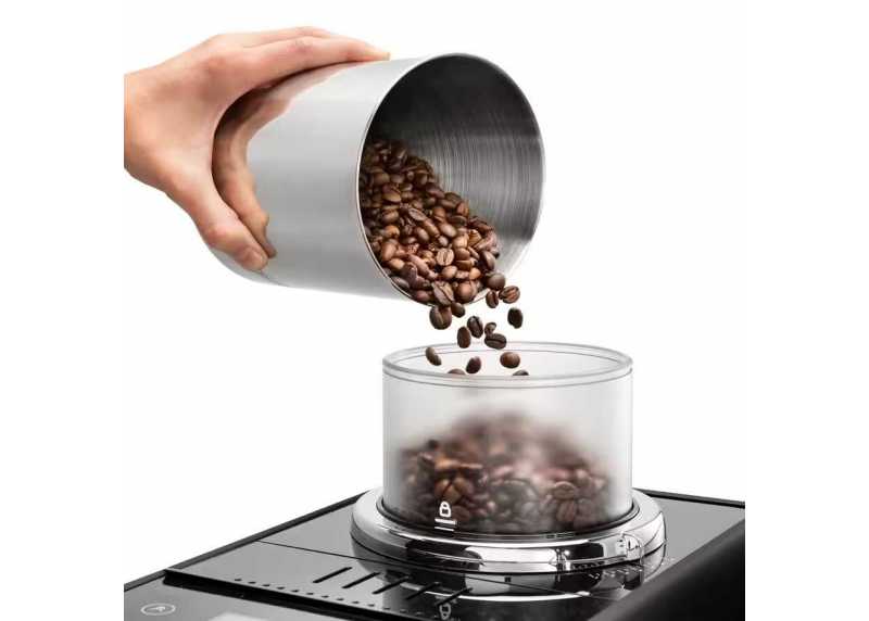 De'Longhi plnoautomatický kávovar s vestavěným mlýnkem na kávová zrna pro přípravu teplých, ledových a mléčných nápojů. Na jedno stisknutí připraví až 16 různých nápojů. Pěnička na mléko. Výměnné zásobníky kávových zrn.
