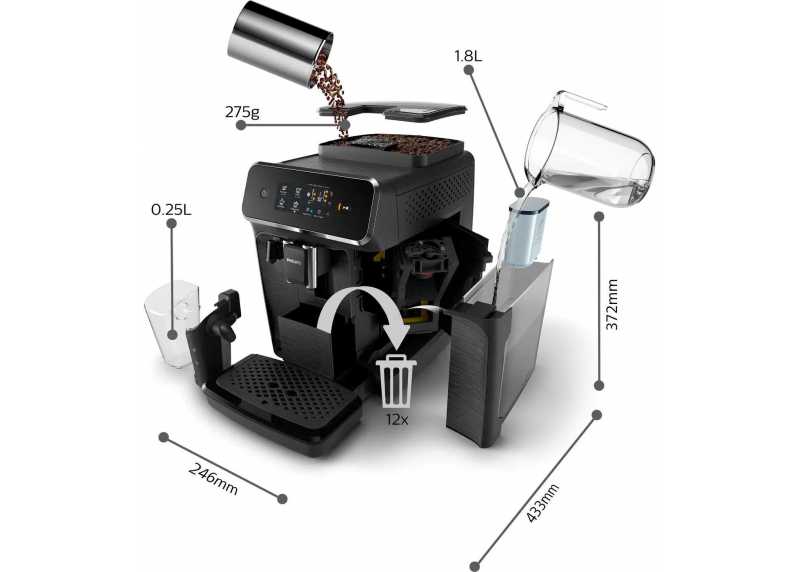 Kávovar připravuje na jedno stisknutí 4 různé horké nápoje. Klasikou je samozřejmě espresso a klasická káva. Dále vám uvaří i vodu, abyste si rovnou zalili čaj a nakonec je tu díky mléčnému systému i lahodné cappuccino. Snadné ovládání přes dotykový černobílý displej.
