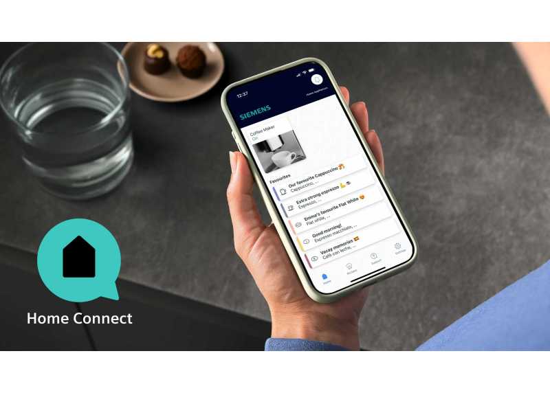 Kávovar lze ovládat i na dálku přes aplikaci Home Connect, která umožňuje vytvořit seznam oblíbených nápojů, spouštět přípravu kávy z telefonu a objevovat rozšířenou nabídku světových specialit včetně variant jako Black Eye, Café au lait, Cortado, Galão nebo Wiener Melange. Aplikace nabízí také funkci coffeePlaylist pro pohodlné zadávání více nápojů za sebou a díky propojení s Amazon Alexa je možné řídit kávovar i hlasem.
