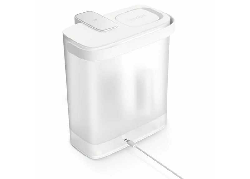Konvice je vybavena elektronickým indikátorem životnosti filtru, který sleduje skutečný objem filtrace a dobu používání. Nabíjení probíhá přes USB-C a po plném nabití vydrží v provozu až jeden měsíc.