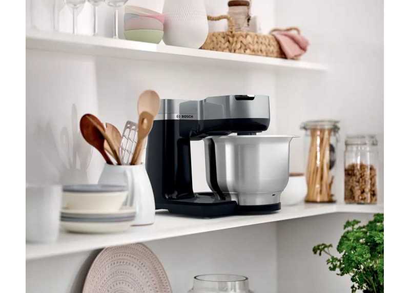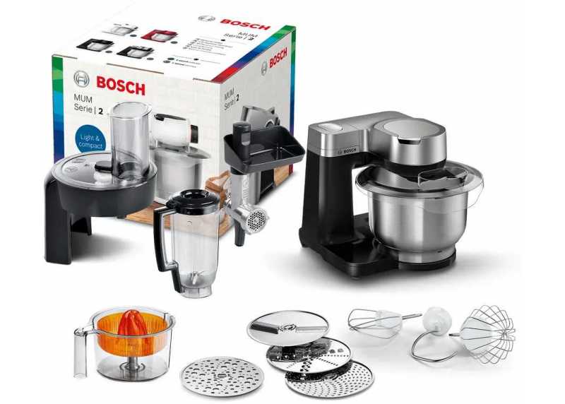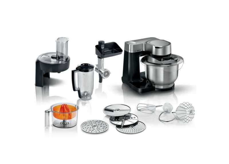 Kuchyňský robot Bosch MUM 900 W; 3D planetární hnětení; objem mísy 3,8 l; 7 rychlostí; bohaté příslušenství: šlehací metla, míchací metla, hnětací hák, průhledný kryt mísy, mixér, kráječ, lis na ovoce a mlýnek na maso; rozměry 27,7 × 26,6 × 26,6 cm