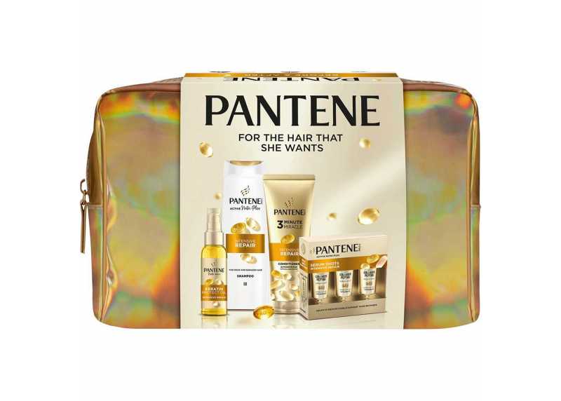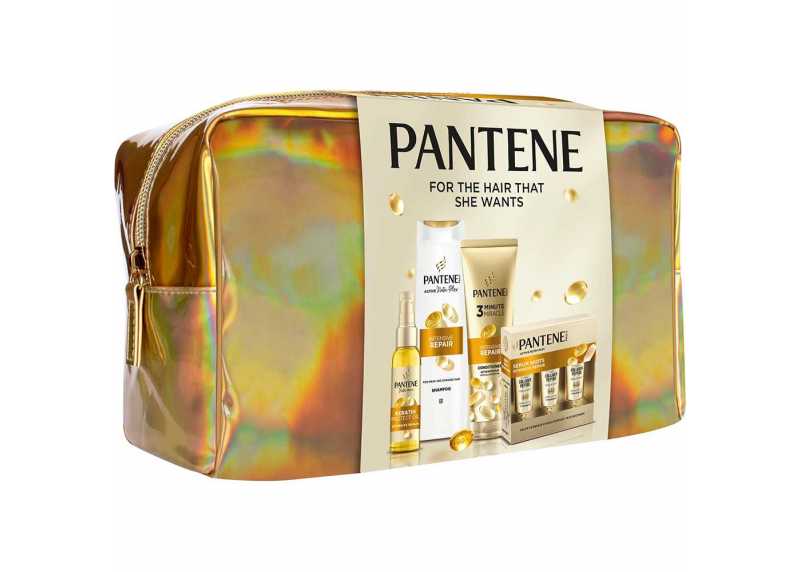 Dárková sada dámské vlasové kosmetiky PANTENE Golden Bag 615 ml, 4 kosmetické vlasové produkty s jemnými vůněmi.