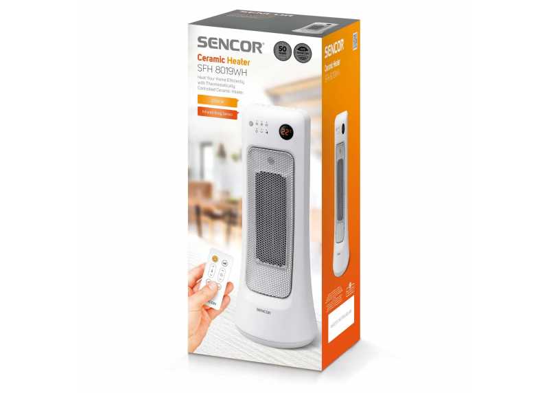 Sencor SFH 8019WH je keramické topidlo s PTC články, které se rychle zahřeje, automaticky přizpůsobuje výkon okolní teplotě a hřeje účinně bez vysušování vzduchu. Nabízí dva stupně 1 200 a 2 000 W, nastavitelný termostat v rozsahu 5–35 °C a volitelnou oscilaci 80° pro rovnoměrné rozptýlení tepla po místnosti. Tichý provoz okolo 50 dB doplňuje kvalitní vzduchový filtr, Body senzor s detekcí osoby do 1,8 m a úsporný Eco režim pro nižší spotřebu. Ovládání je pohodlné dotykově i dálkovým ovladačem a díky rukojeti a nízké hmotnosti se přístroj snadno přenáší mezi místnostmi. Ideální volba do bytu, kanceláře i na chatu, když chcete rychle a komfortně zahřát sebe i okolí.