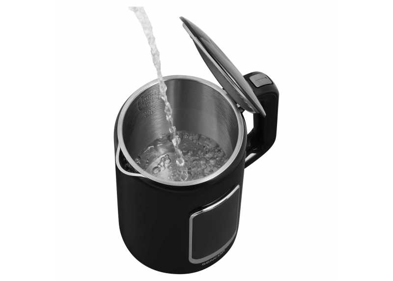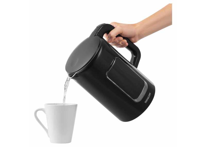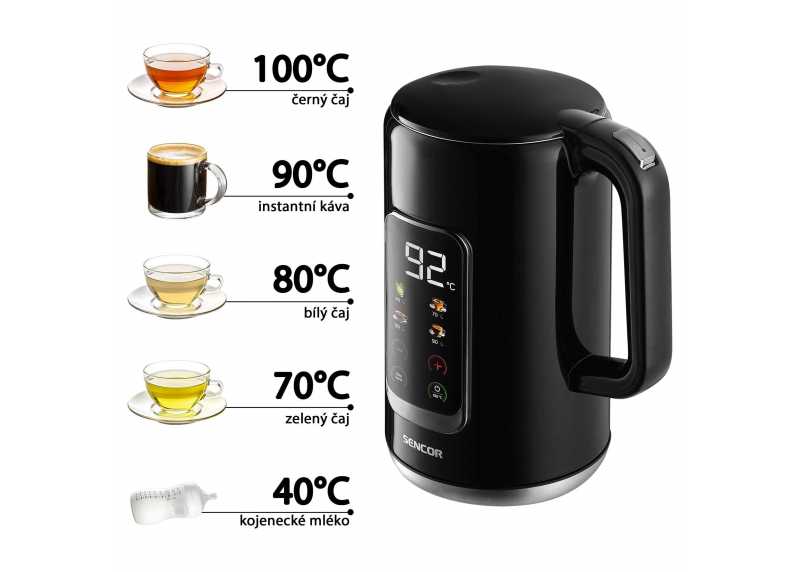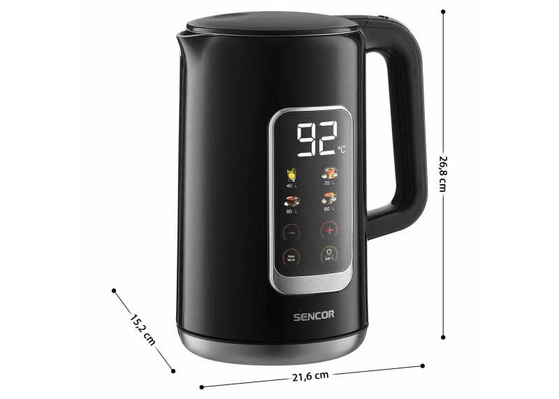 Rychlovarná konvice SWK 0951BK s nerezovým dvojitým pláštěm zůstává na dotek chladná i po uvaření vody. Na těle konvice je velký přehledný LED displej s dotykovým ovládáním Direct Touch, který usnadní volbu teploty v rozsahu 40–100 °C i přehled o aktuální hodnotě. Funkce Keep Warm udrží vodu zahřátou bez opakovaného převařování. Příkon 2 200 W zajišťuje rychlý ohřev a ploché dno s ukrytou spirálou ohřívá rovnoměrně a lépe se čistí. Trojitý bezpečnostní systém zahrnuje automatické vypnutí po dosažení nastavené teploty, ochranu proti přehřátí a vypnutí při provozu bez vody. Otočný 360° podstavec ulehčí usazení z jakéhokoli směru a moderní černé provedení zapadne do každé kuchyně.
