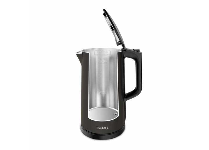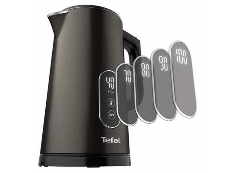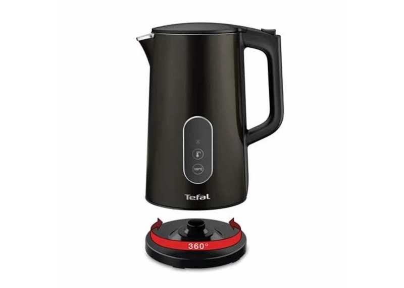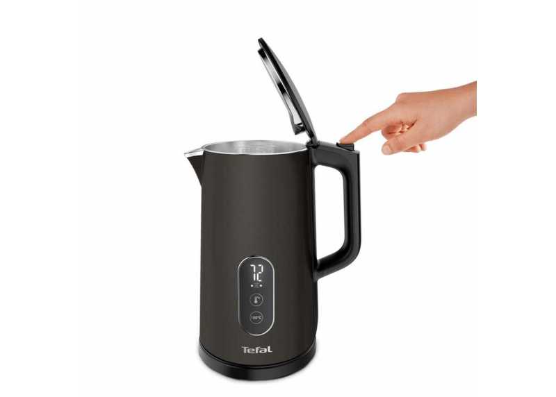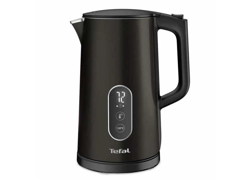 Rychlovarná konvice Tefal v černém provedení. Dotykové ovládání, 5 variant nastavení teploty, dvojitý plášť, objem 1,7 l, výkon 1800 W, vyjímatelný filtr.