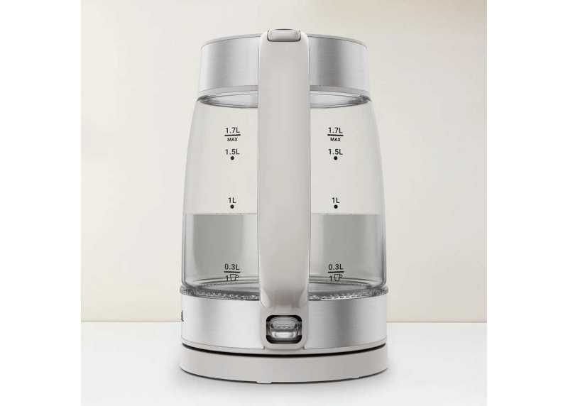 Rychlovarná konvice ve skleněném provedení. Ovládání na těle konvice, dvojitý plášť, 1,7 l kapacita, výkon 2200 W.