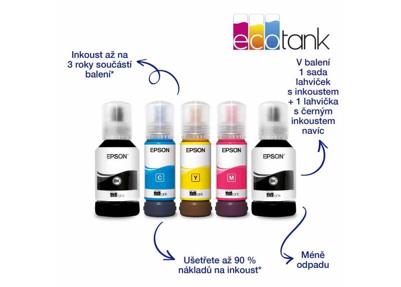 Místo kazet vsadil Epson u tohoto modelu na doplňování přímo z lahviček. Každá barva má vlastní zámkový mechanismus, aby nedošlo k špatnému nadávkování. Doplňování je snadné a bez zašpinění. V balení najdete tři lahvičky o 70 ml s barevným inkoustem a dvě lahvičky s černou o 127 ml. Vystačit by vám tato sada měla až na 3 roky tisku.