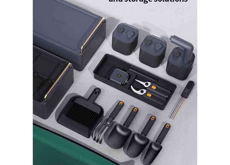 Sada zahradního náčiní pro základní úkony na zahradě i terase. Nástroje a příslušenství jsou prakticky zabaleny ve dvou stohovatelných boxech s hliníkovými madly pro snadné přenášení a uskladnění. Každý nástroj má v příslušeném boxu své místo, do kterého přesně padne, takže se nestane, že byste měli mít v boxexh nepořádek nebo se vám něco zpřeházelo. Sada obsahuje všechyn základní nástroje, které byste pro svou práci mohli potřebovat - lopatky, hrabičky, přesazovací podložku, úklidové nástroje, postřikovače, nůžky a další.