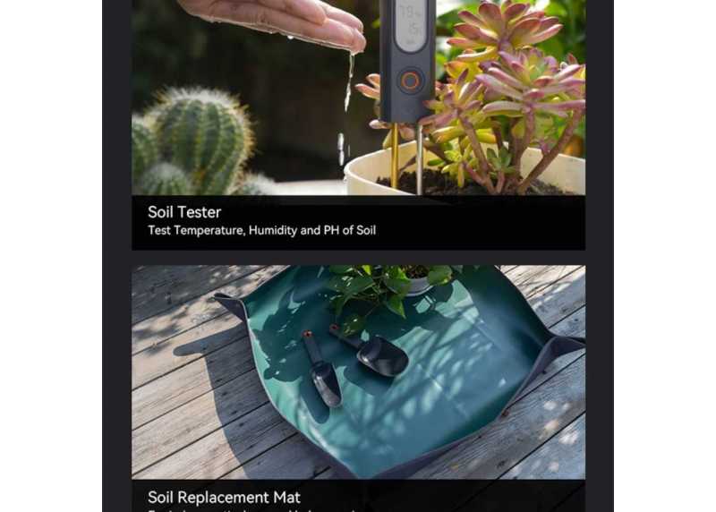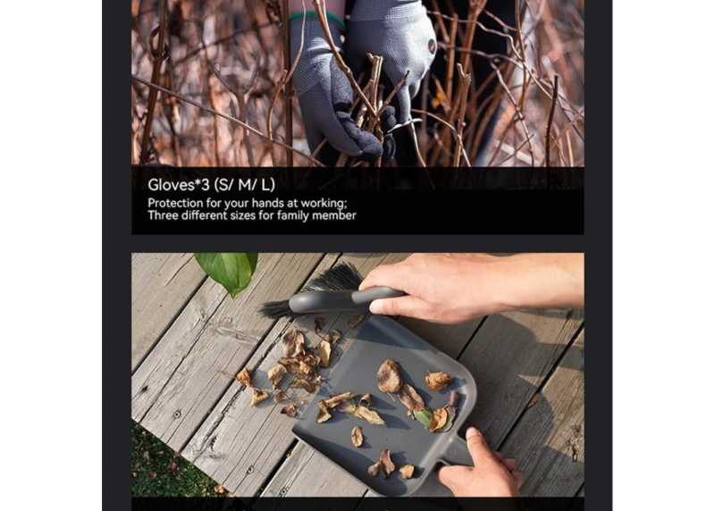 Box A: Lžíce, lopatka, úzká lopatka, ruční hrabičky, tester půdy, 3 páry zahradních rukavic (velké, střední, malé), košťátko s lopatkou, přesazovací podložka 75×75 cm