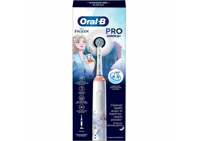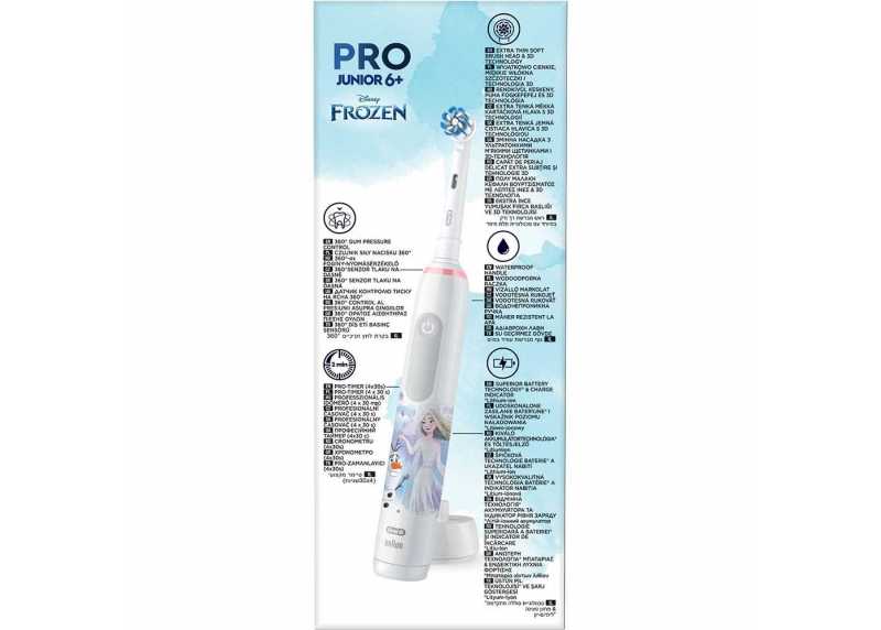 Oral-B Pro Junior Ledové Království je dětský elektrický zubní kartáček, který spojuje šetrnou péči o zuby s motivací v podobě oblíbené postavičky. Jemná iO technologie účinně odstraňuje plak a zároveň chrání citlivé dětské dásně. Lehká konstrukce, malá hlavice a jednoduché ovládání zajišťují pohodlné čištění i pro nejmenší. Kartáček děti vede k doporučené délce čištění díky zabudovanému časovači a motivuje je ke správným návykům. S výměnnými nástavci a hravým designem je tento model skvělou volbou pro každodenní péči o zdravý dětský úsměv.